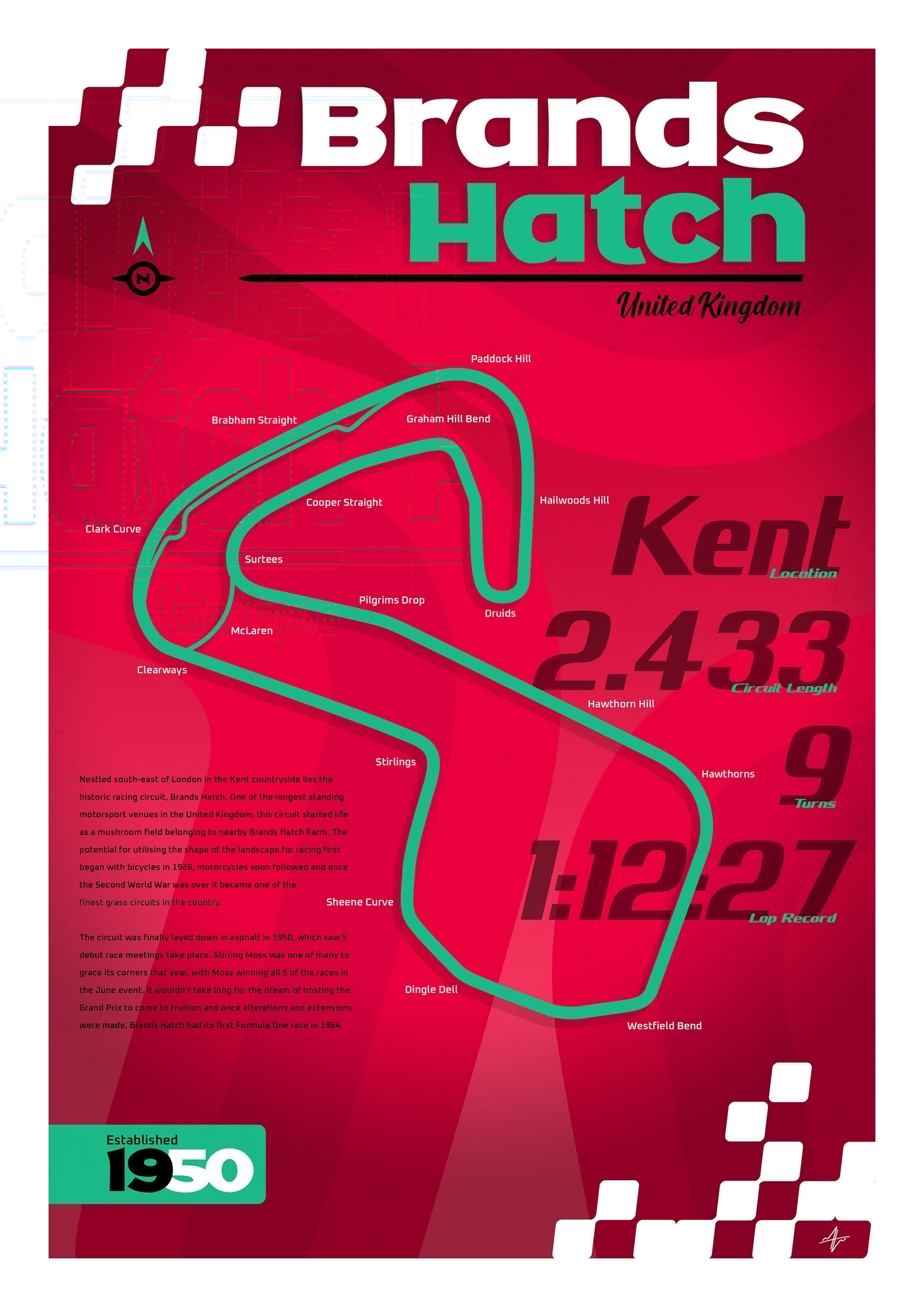 Any race track you want to adorn you home or office walls, from Donington to Spa, Silverstone to Estoril - recreated in the style shown above. Make your purchase, then send a message in the 'contact us' form specifying which track you prefer, sit back and wait for your custom print to arrive!